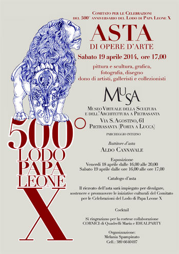 A conclusione del ricco programma di festeggiamenti, il Comitato Promotore per le Celebrazioni del 500° anniversario del Lodo di Papa Leone X, organizza in data 19 aprile p.v. un asta di raccolta fondi con opere d’arte – disegni, quadri ed alcune sculture – di Giovanni Balderi, Antonio Barberi, Giuseppe Bergomi, Girolamo Ciulla, Novello Finotti, Lodovico Gierut, Stefano Pierotti, Cinthya Sah, Choi Yoon Sook, Gabriele Vicari ed altri ancora. Sarà possibile visionare quanto esposto per l’asta anche il giorno precedente venerdì 18 aprile.