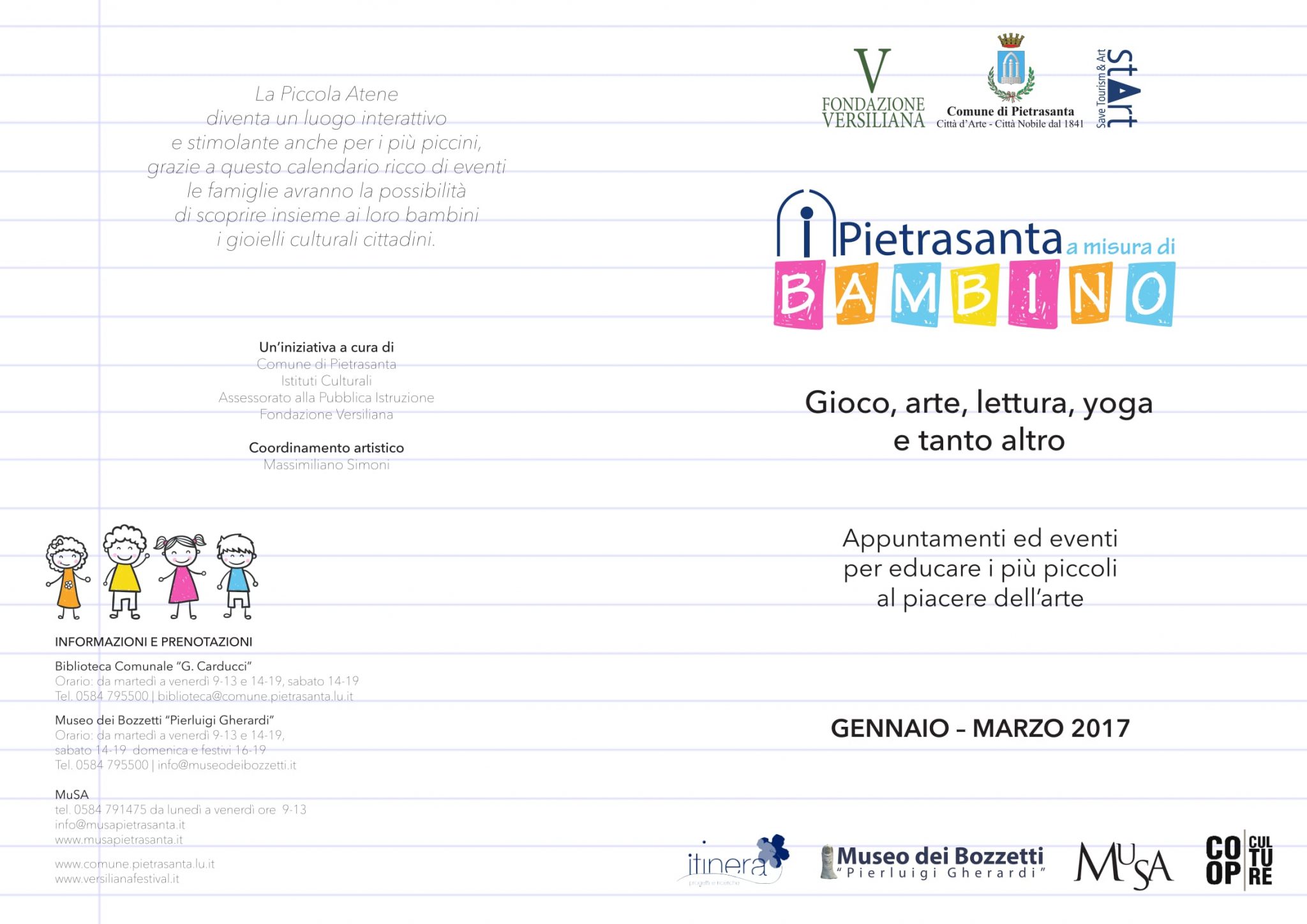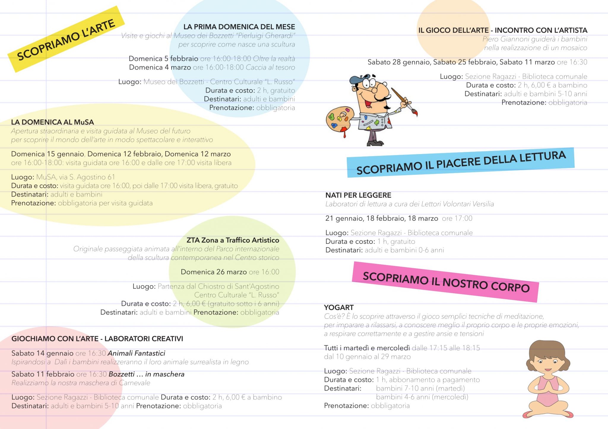 - YOGART: con Valentina Benassi (responsabile organizzativa Versiliana dei Piccoli). Scoprire attraverso il gioco semplici tecniche di meditazione, per imparare a rilassarsi, a conoscere meglio il proprio corpo e le proprie emozioni, a respirare correttamente e a gestire ansie e tensioni. Dal 10 gennaio al 29 marzo. Tutti i martedì e mercoledì dalle 17:15 alle 18:15. Sezione ragazzi, Biblioteca Comunale. Prenotazione obbligatoria, dettagli abbonamento in brochure.