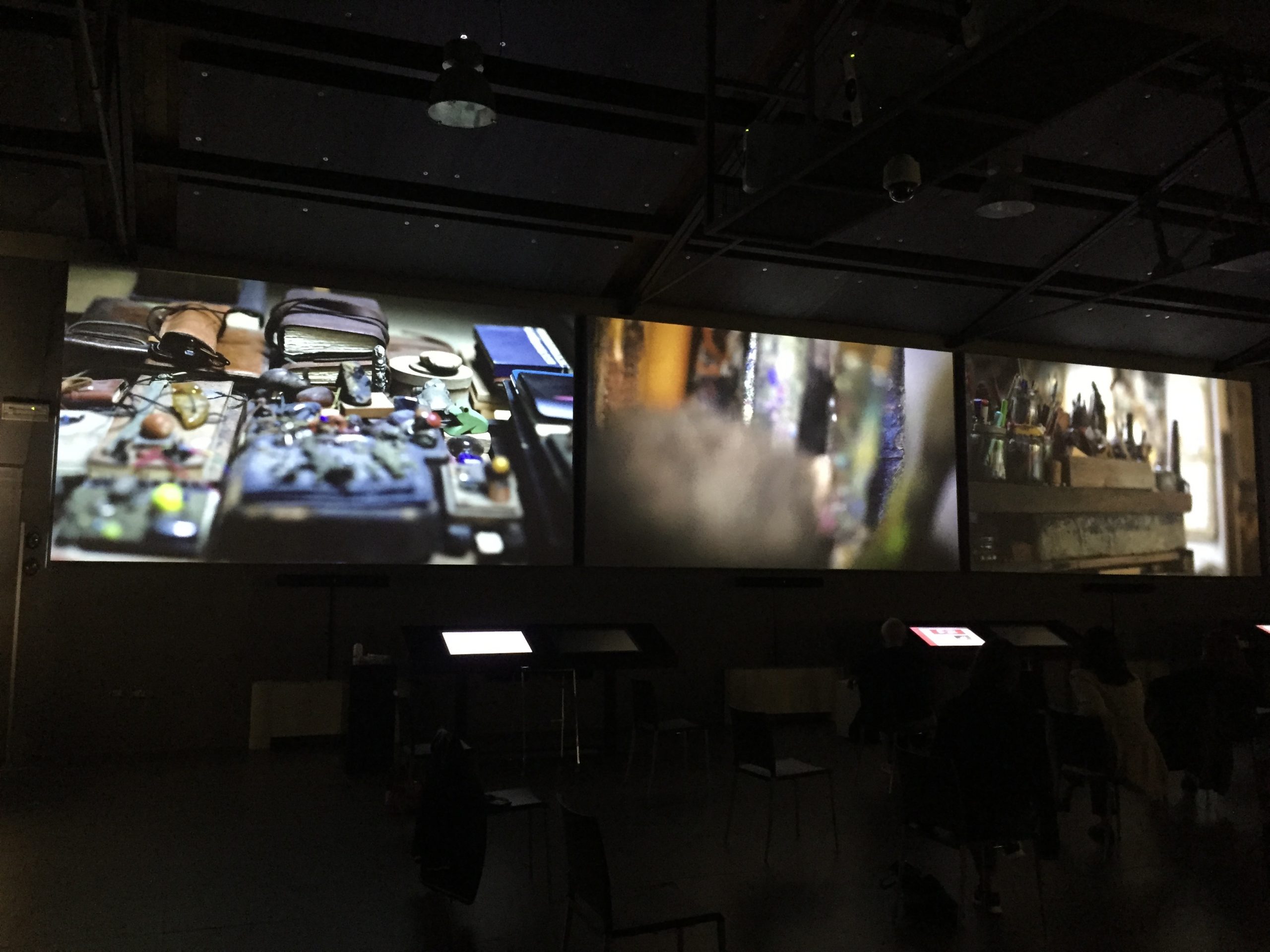 I lavori presentati in questa occasione sono tre e offrono, secondo lo spirito che anima il progetto, uno sguardo su ambiti artistici diversi – quello di un videoartista, Marcantonio Lunardi, un pittore-scultore, Sandro Martini, e uno scenografo, Daniele Spisa –, seguendo il filo rosso di un racconto audiovisivo che cerca di creare consonanze tra parola e immagini, e si offre come un invito alla scoperta – al di là dell’opera, intorno ad essa – della natura del processo artistico.